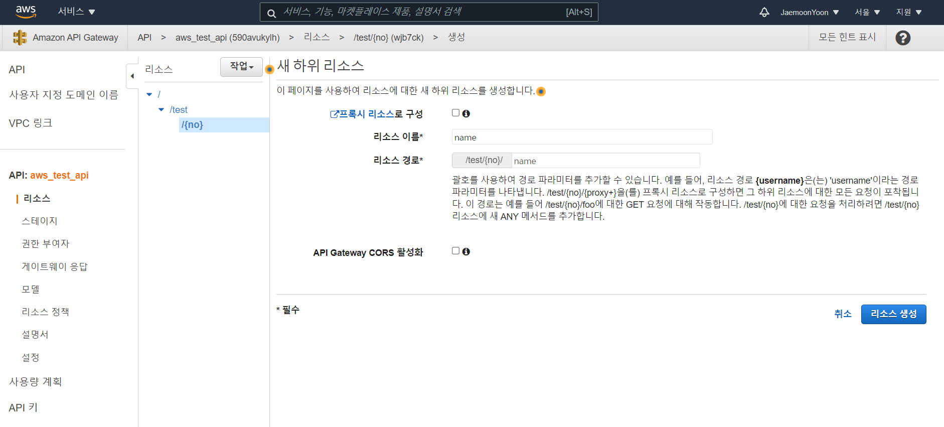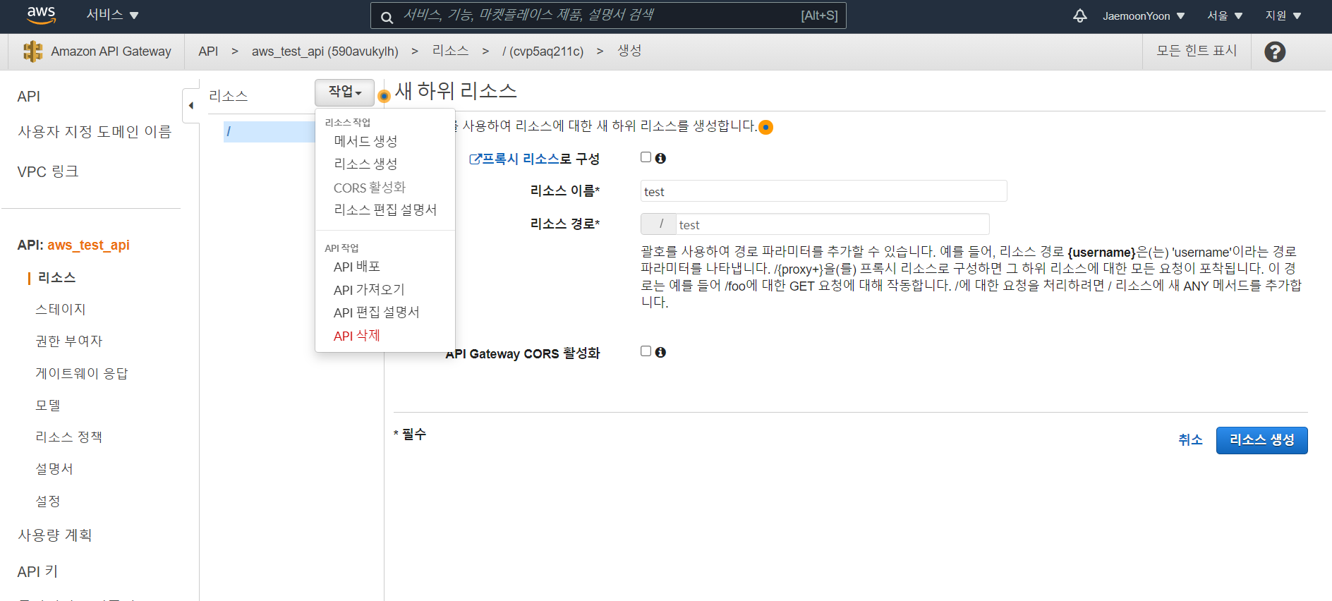 test라는 리소스를 만들었다.
