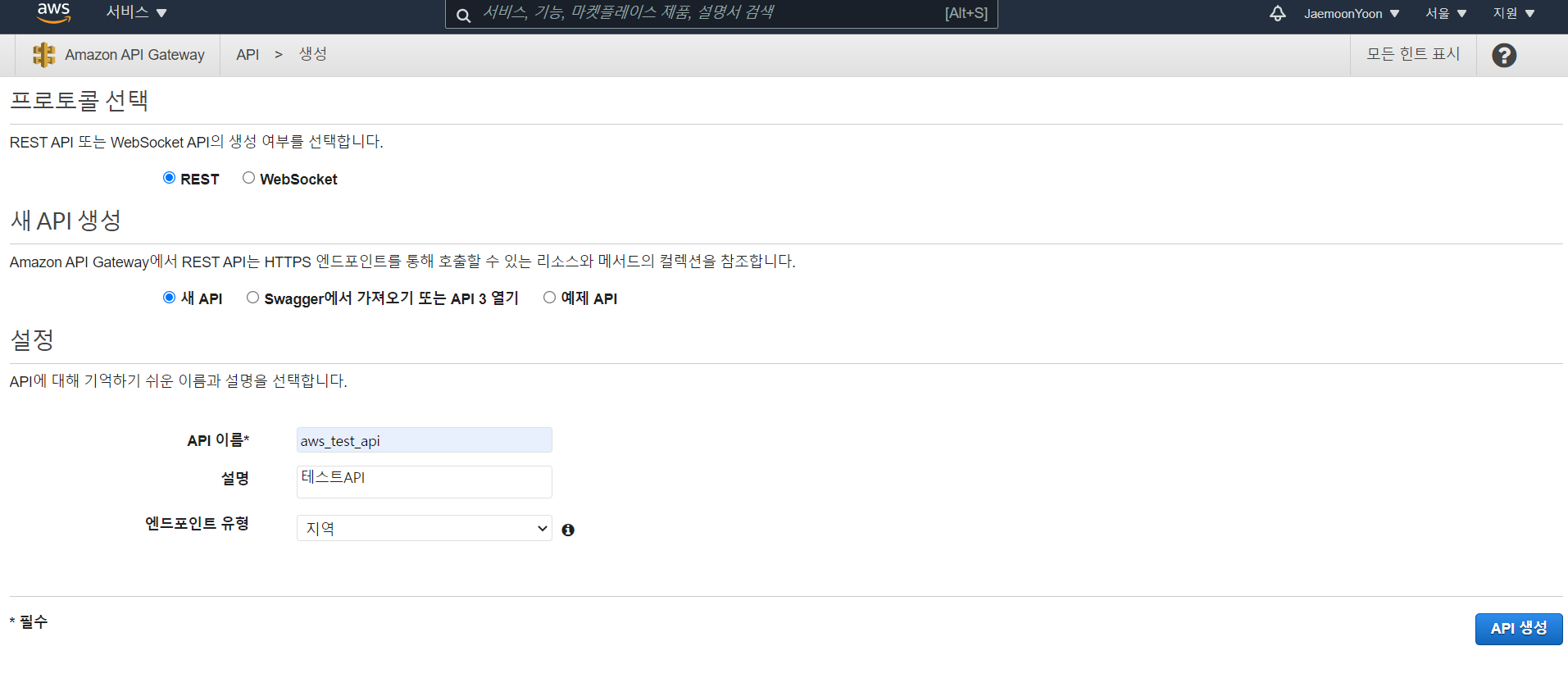 REST선택, 새API선택하고 이름 설정